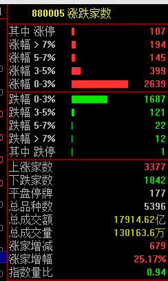 市场共3377只个股上涨,107只个股涨停,1842只个股下跌。